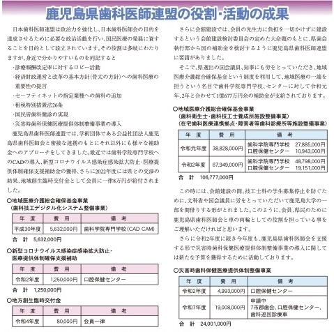 ホーム 歯科医師連盟について 日本歯科医師連盟は昭和26年に「日本歯科医師政治連盟」として設立され、 今日まで歯科界代表の多くの国会議員を輩出し、歯科医療関係の法律の改正、制定に携わってきました。 鹿児島県歯科医師連盟はなぜ必要なのか 歯科医師連盟は歯科医師と国を繋げる役目をしています 議会制民主主義では国民個々の意見が選挙以外で直接反映されるのは非常に困難です。 そこで政党・政治家・政治団体を通じて意思表示をし、政治に参加しなければなりません。 近年の歯科医師連盟の役割・活動成果ダウンロード